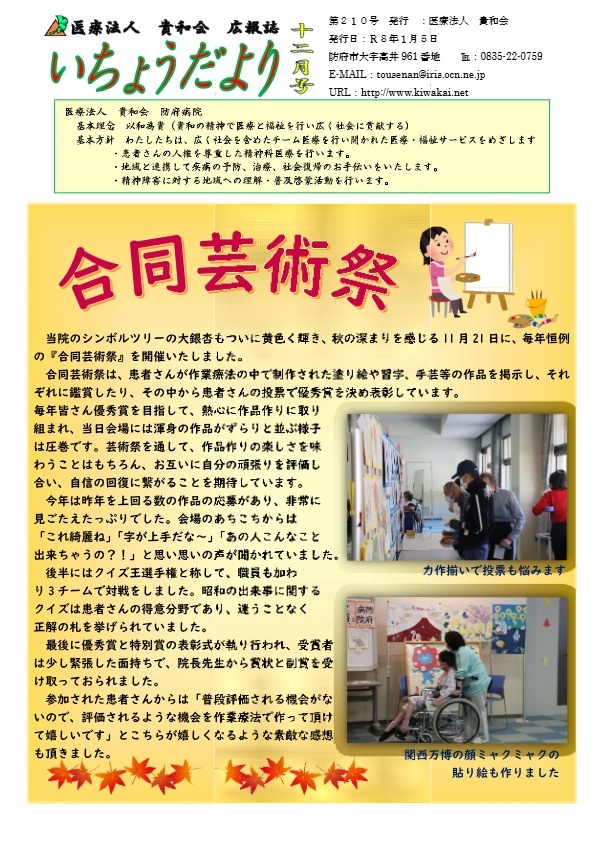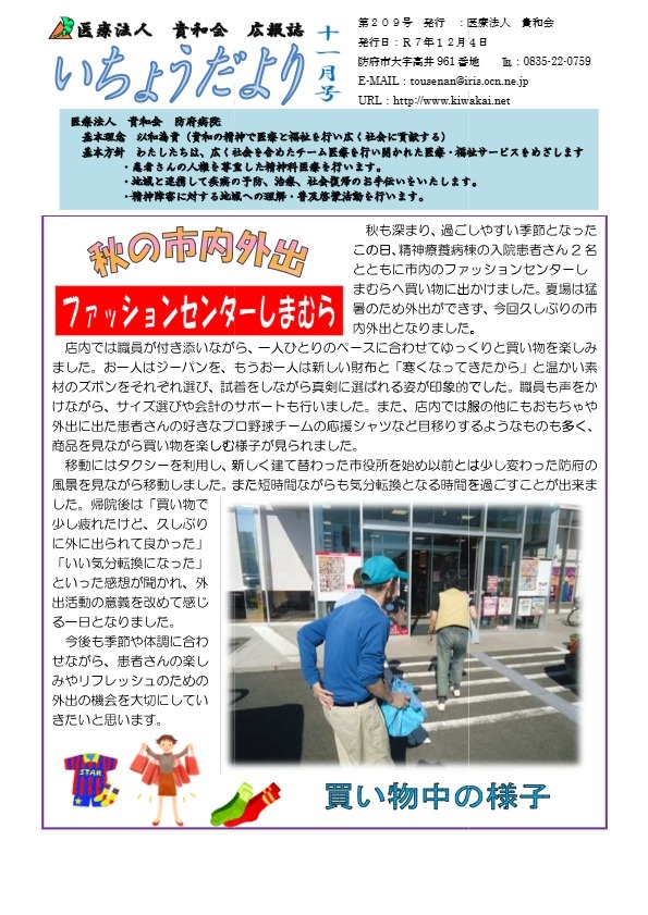いちょうだより 私たちは、広く社会を含めた地域医療を行い、開かれた医療・福祉サービスを目指しています。 そのため、精神障害に対する地域のご理解、普及啓もう活動の一環として、平成16年12月を創刊号とし現在まで続いています。 現在、医療機関、行政機関、教育機関、近隣自治会などにお届けしています。 令和7年度 12月号 11月号 10月号 9月号 8月号 7月号 6月号 5月号 4月号 令和6年度 3月号 2月号 新年号 12月号 11月号 10月号 9月号 8月号 7月号 6月号 5月号 4月号