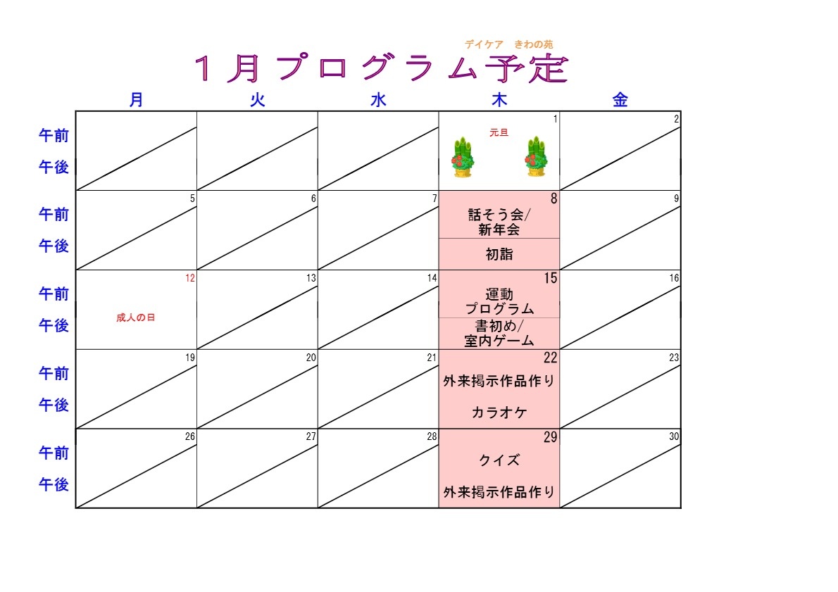 病棟の行事等に合わせて1月のボランティア予定表に更新いたしました。(R7.1.5更新)